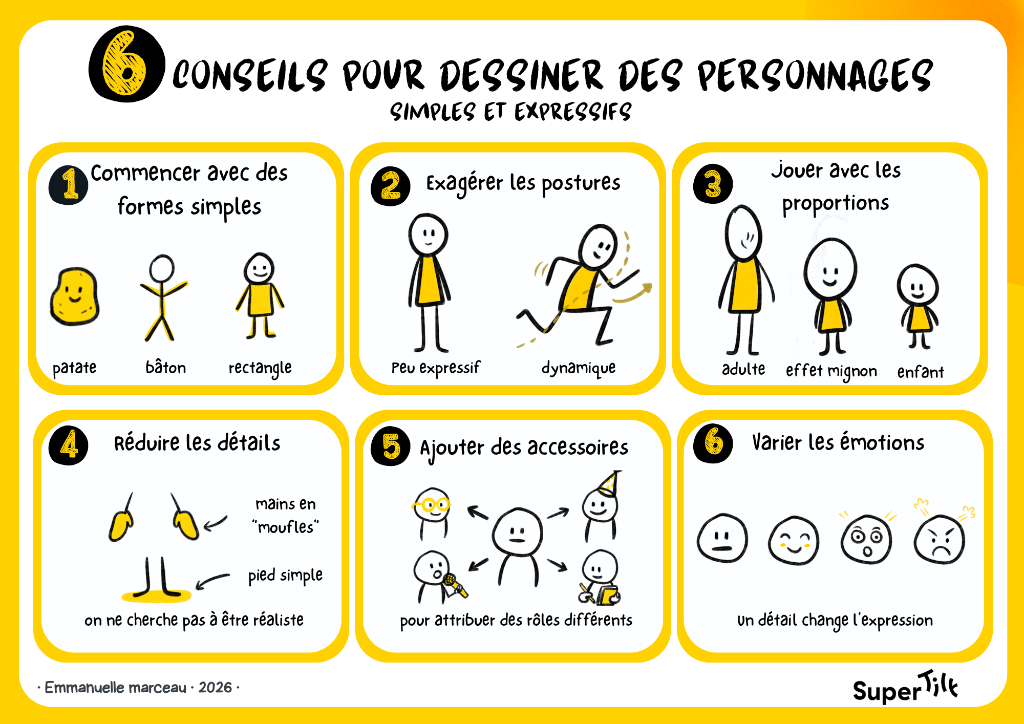 Avec quelques formes de base, un peu d’exagération et deux ou trois accessoires bien choisis, vous pouvez déjà représenter beaucoup de situations.