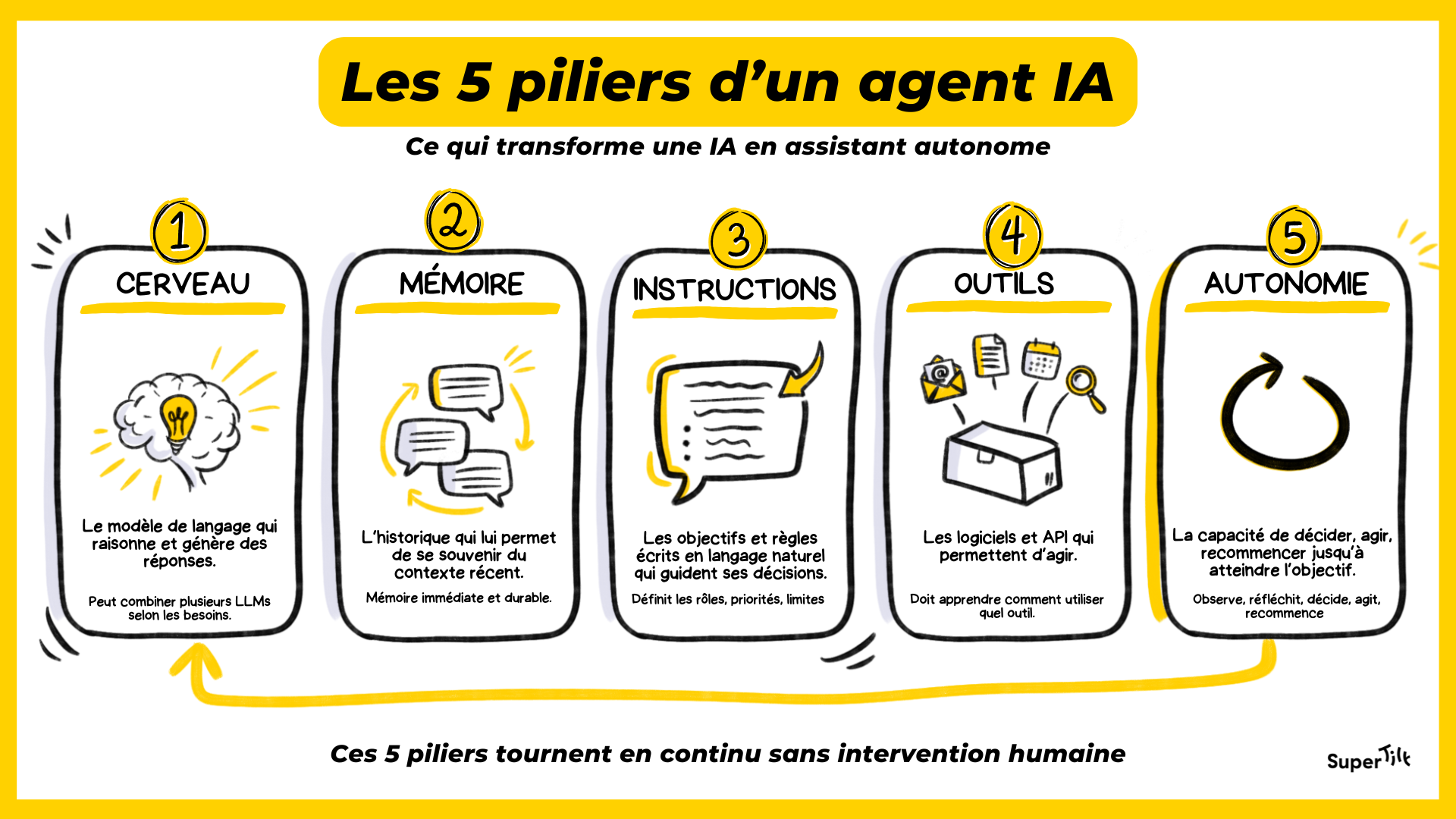 5. De l’autonomie : il prend des décisions et agit sans attendre qu’on le relance. Il est dans une logique de boucle d’actions (observer / agir / vérifier / ajuster.) C’est ce qui différencie un agent d’un simple outil.